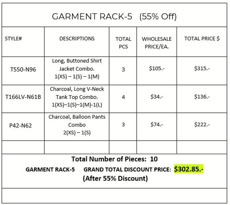 Rack 5 RACK 5 55% OFF WHOLESALE PRICE WHILE SUPPLY LAST IMMEDIATE DELIVERY For more info please call : Marta (702) 7017085 email: info@harubella.com